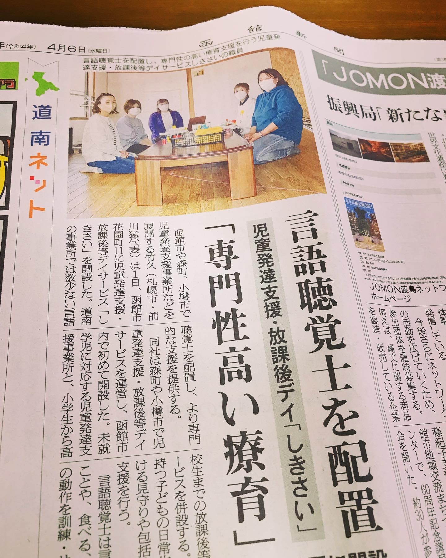 函館新聞さんに掲載して頂きました! こんにちは、しきさいです!昨日4月6日の「函館新聞」さんに、しきさいを掲載していただきました!職員は全員ガチガチに緊張していましたが素敵な写真をチョイスしていただき感謝です!取材時もお話しましたが、「なんだか気になる…」「心配だけど、保健師さんに相談するほどかしら…」と思ったら、そのままにせず、どうか気軽にご相談ください。今お子様に何が必要なのか、何を求めているのか一緒に考えていきましょう!